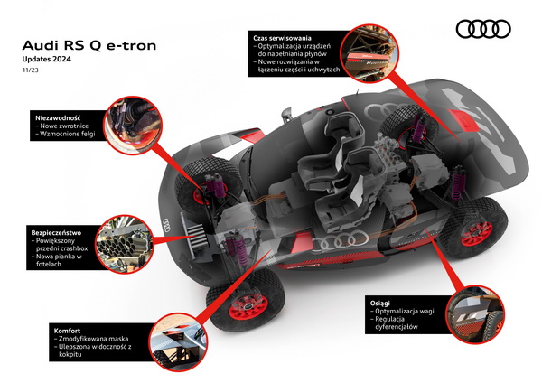 „Nasz zespół inżynierów jeszcze bardziej ulepszył RS Q e-tron, wprowadzając wiele kreatywnych rozwiązań” – mówi Rolf Michl, szef działu sportów motorowych. „Kierowcy i piloci, ale również wszyscy mechanicy i inżynierowie, korzystają z pomysłowych rozwiązań. Czujemy, że jesteśmy doskonale przygotowani do Rajdu Dakar”. Od połowy roku Audi sukcesywnie wprowadza zmiany i je testuje, zapewniając tym samym, że wszystkie innowacje zostaną wprowadzone na czas przed Rajdem Dakar 2024.