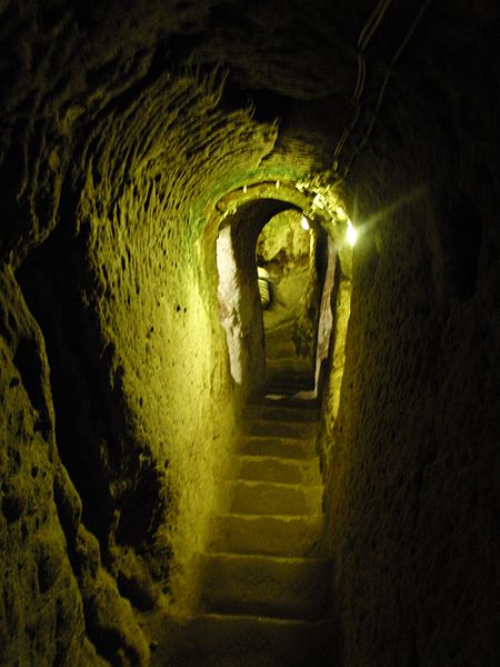 Archeolodzy uważają, że ewolucja miasta nastąpiła z poziomu piwnic wykorzystywanych do przechowywania żywności, dopiero w konsekwencji najazdów piwnice zostały rozbudowane aby mogły służyć również jako kryjówki i miejsce obrony. Tunele posiadały możliwość zablokowania wejścia od środka okrągłymi, kamiennymi drzwiami, a przejścia między nimi były na tyle wąskie, że mogła zmieścić się w nich tylko jedna osoba.